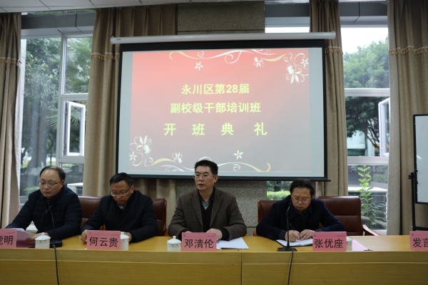 邓清伦副主任发表讲话。他介绍了永川区教委举办这次副校级干部培训班的目的意义,并就如何完成好这次培训任务从三个方面对培训学员提出了明确要求:一是学员要统一思想、提高认识,准确把握本次培训的目的,做好角色的转换;二是参训学员要端正态度、勤学善思,确保本次培训能够学有所获;三是学员要遵守纪律、严格要求自己,确保本次培训任务圆满完成。