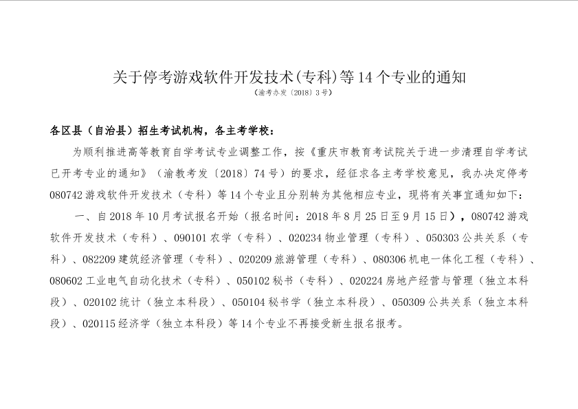 《关于停考游戏软件开发技术(专科)等14个专业的通知》 (渝考办发〔2018〕3号)
